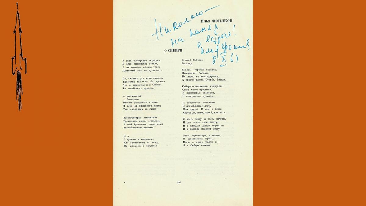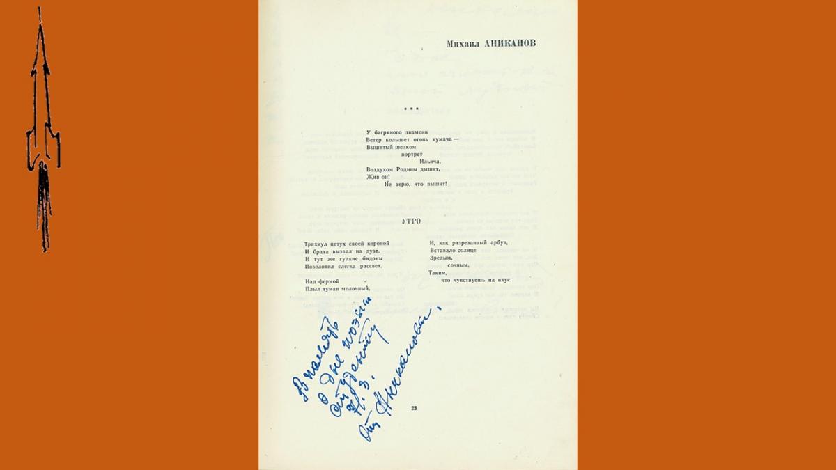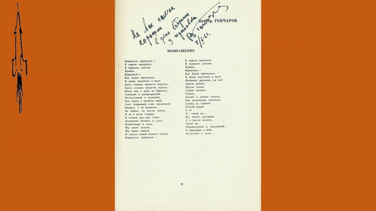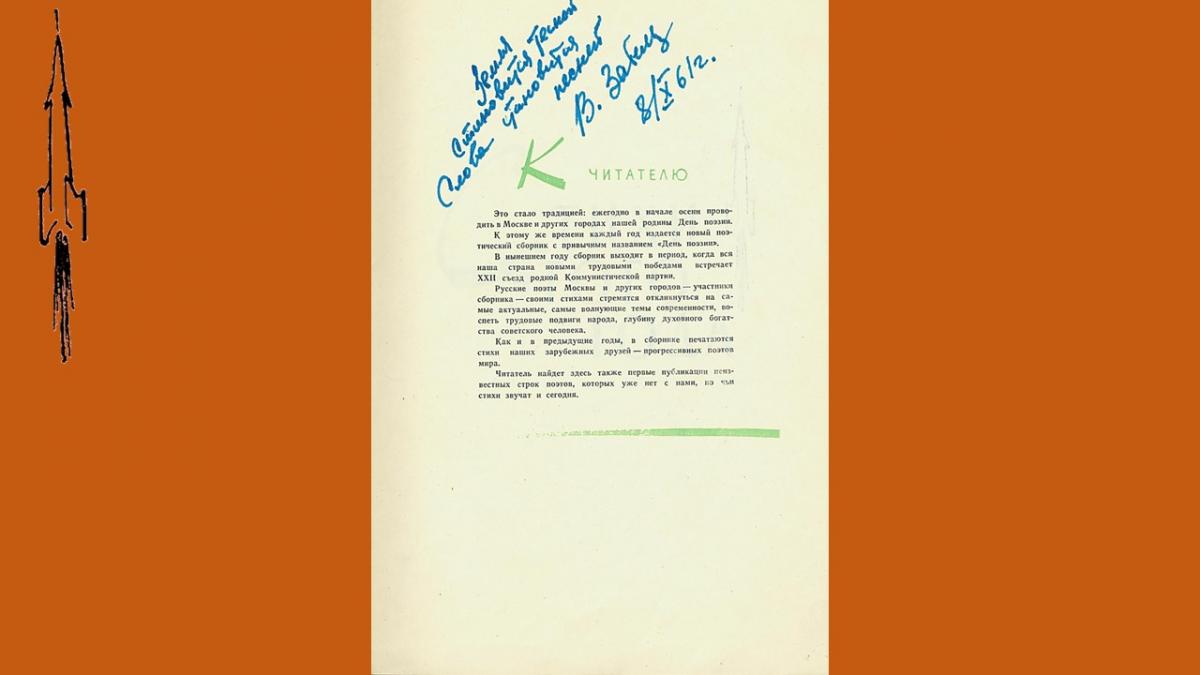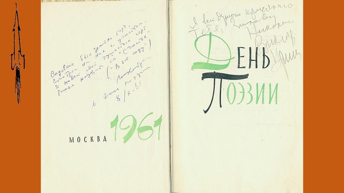 Первый выпуск поэтического альманаха “День поэзии” вышел в 1945 году, в 50-е годы альманах издавался нерегулярно и только, с 1960 стал выходить ежегодно. В 1990 году издание было приостановлено. В 60-е годы альманах был чрезвычайно популярен, тиражи достигали 100 000 экз., публиковались в нем как известные, так и начинающие поэты. Уникальность подаренного библиотеке издания в том, что в него включены более тридцати автографов и дарственных надписей известных советских поэтов – участников сборника, многие из которых сделаны в стихотворной форме.