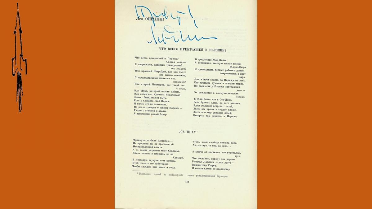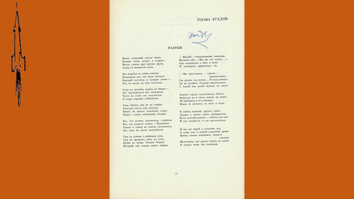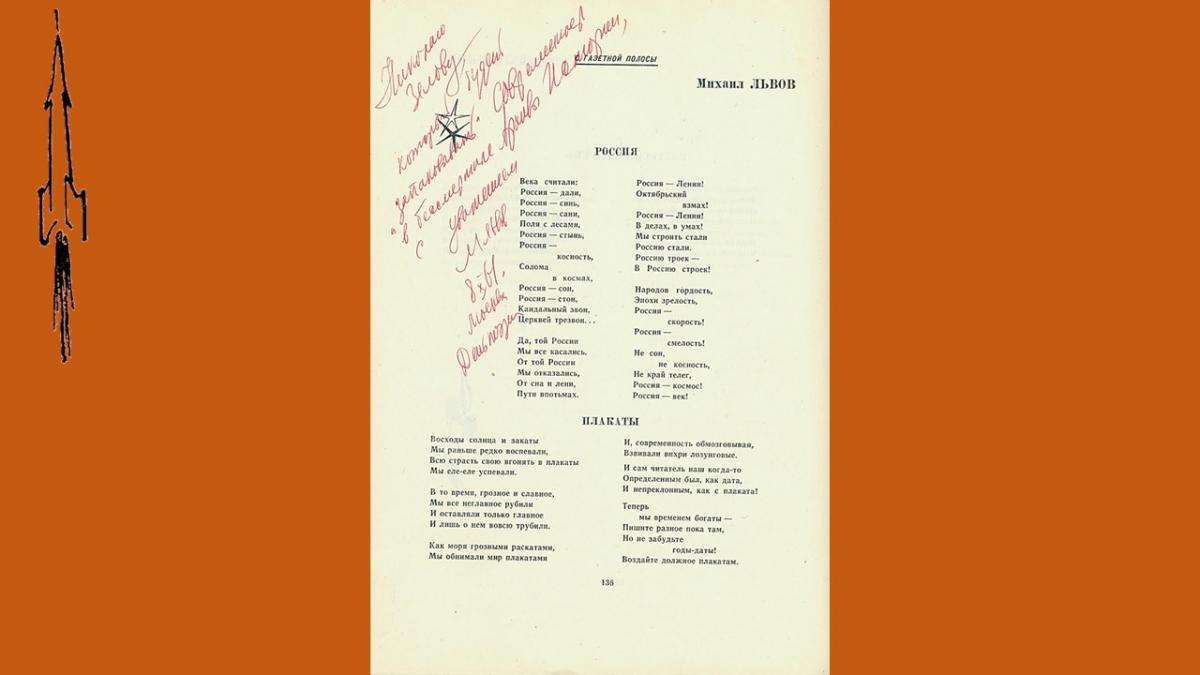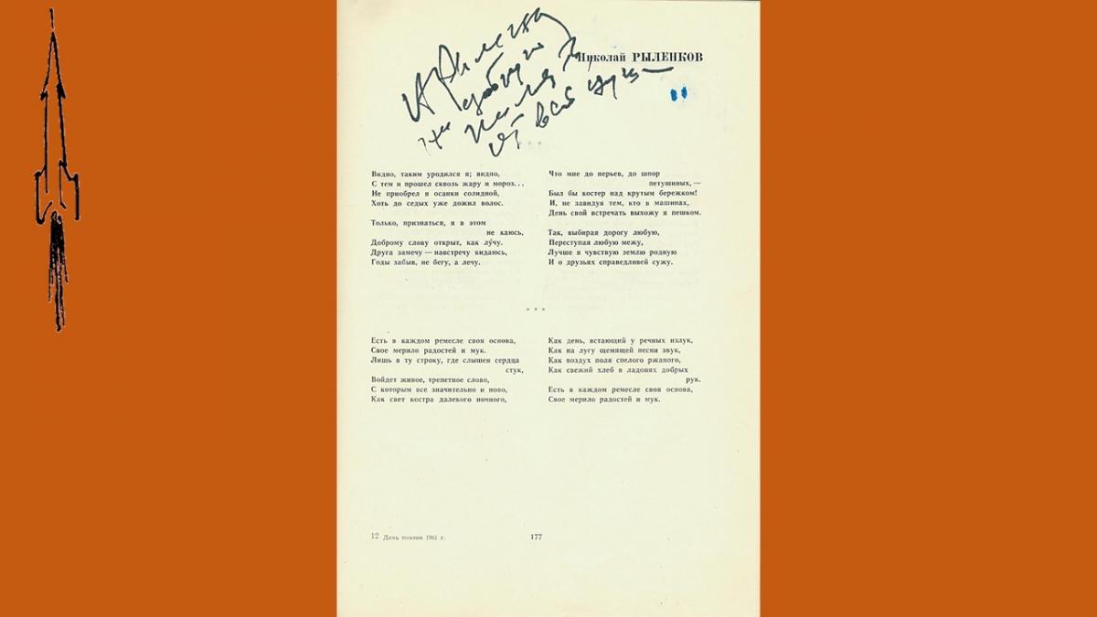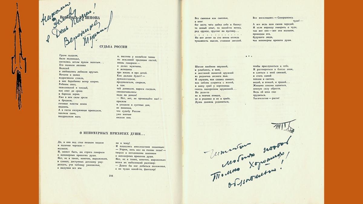 Первый выпуск поэтического альманаха “День поэзии” вышел в 1945 году, в 50-е годы альманах издавался нерегулярно и только, с 1960 стал выходить ежегодно. В 1990 году издание было приостановлено. В 60-е годы альманах был чрезвычайно популярен, тиражи достигали 100 000 экз., публиковались в нем как известные, так и начинающие поэты. Уникальность подаренного библиотеке издания в том, что в него включены более тридцати автографов и дарственных надписей известных советских поэтов – участников сборника, многие из которых сделаны в стихотворной форме.