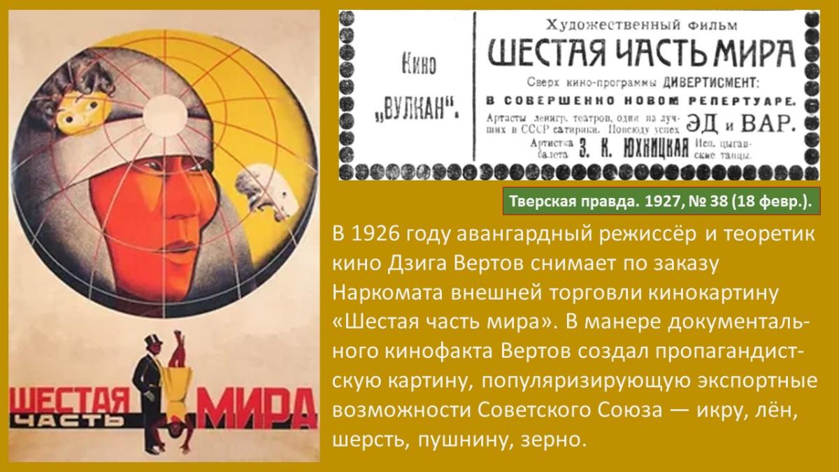 В 1926 году Дзига Вертов снял документальный агитационный фильм «Шестая часть мира». Эту работу режиссер создал по заказу Госторга РСФСР — организации, которая занималась внешней торговлей. Режиссеру поручили снять ленту о природных богатствах СССР. Специально для фильма восемь киноэкспедиций отправились в разные части страны — от Крайнего Севера до Кавказа. В картину включили кадры охоты на пушных зверей, уборки льна, стрижки овец. Так режиссер показал, на чём специализируются разные регионы СССР. Конец фильма посвящён Октябрьской революции 1917 года. По задумке авторов, эти кадры показывают, что все природные богатства достались стране после тяжёлой борьбы.
