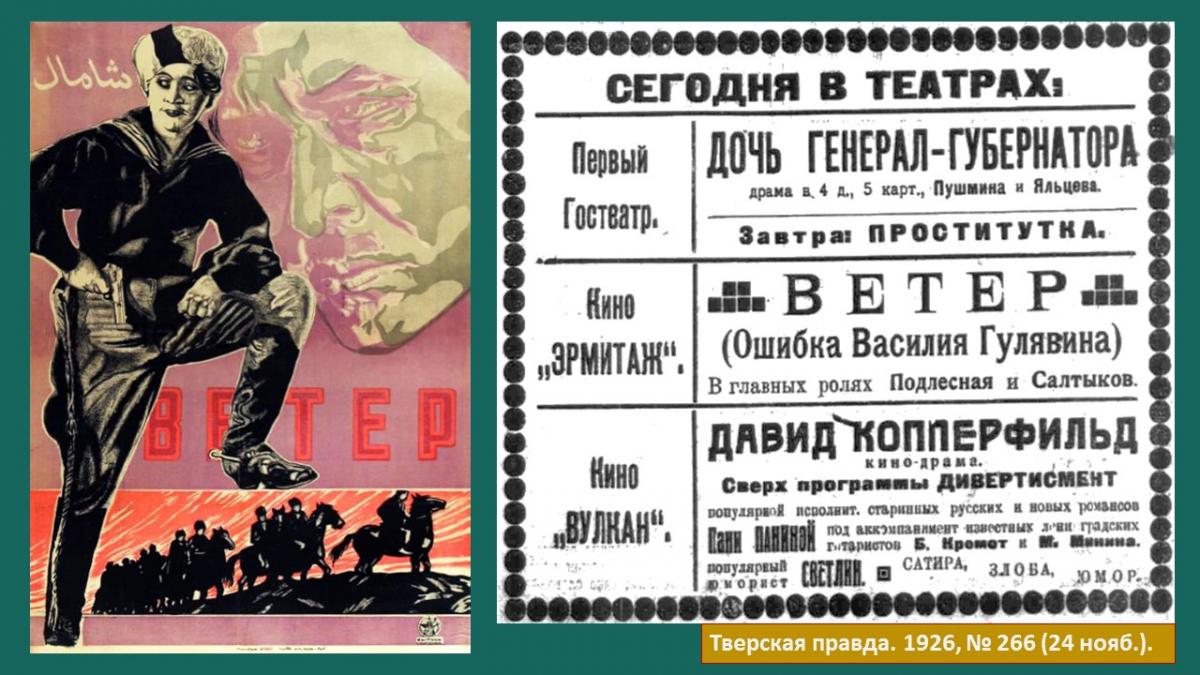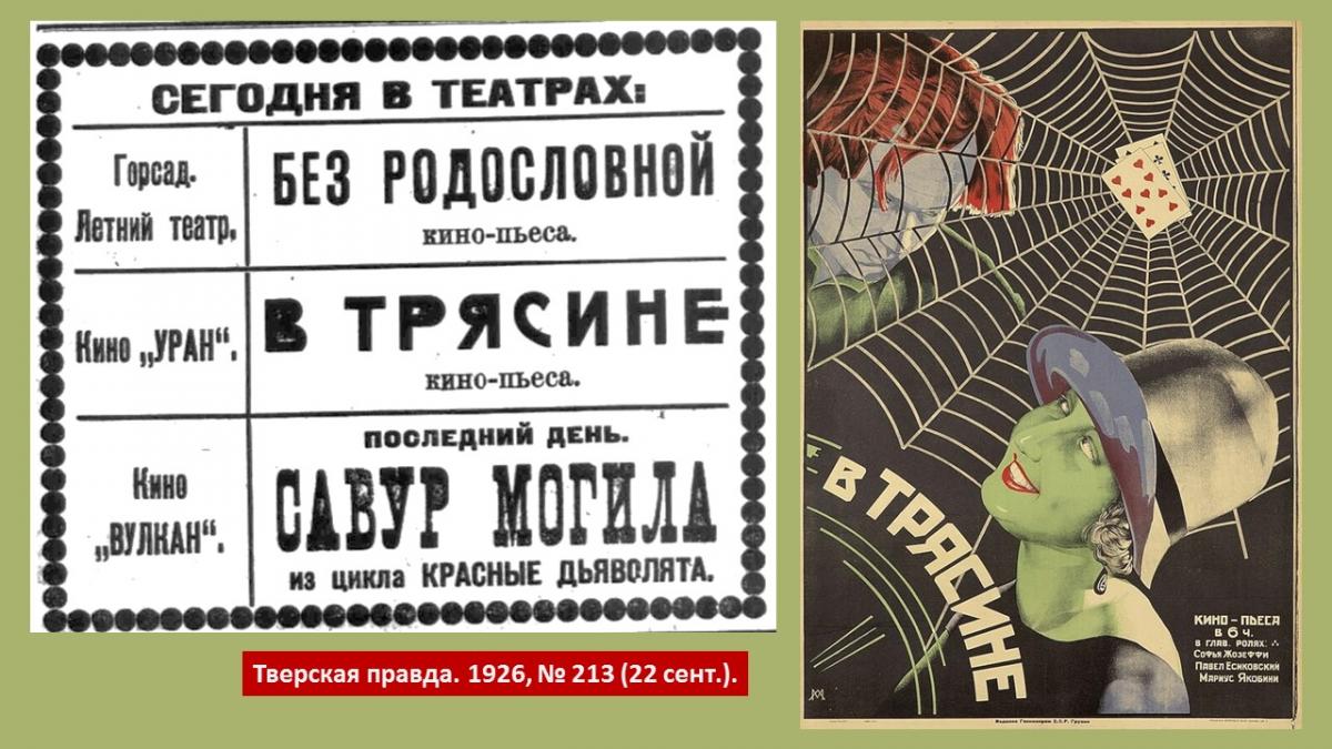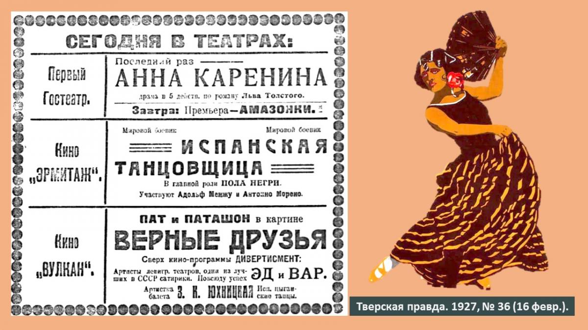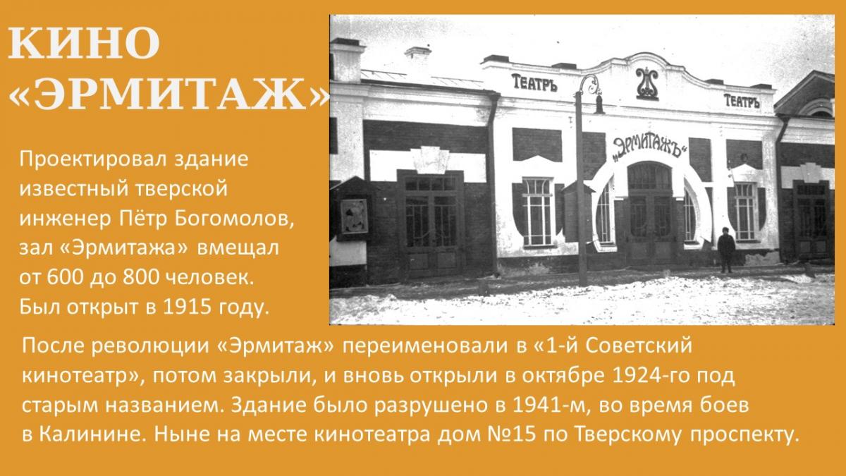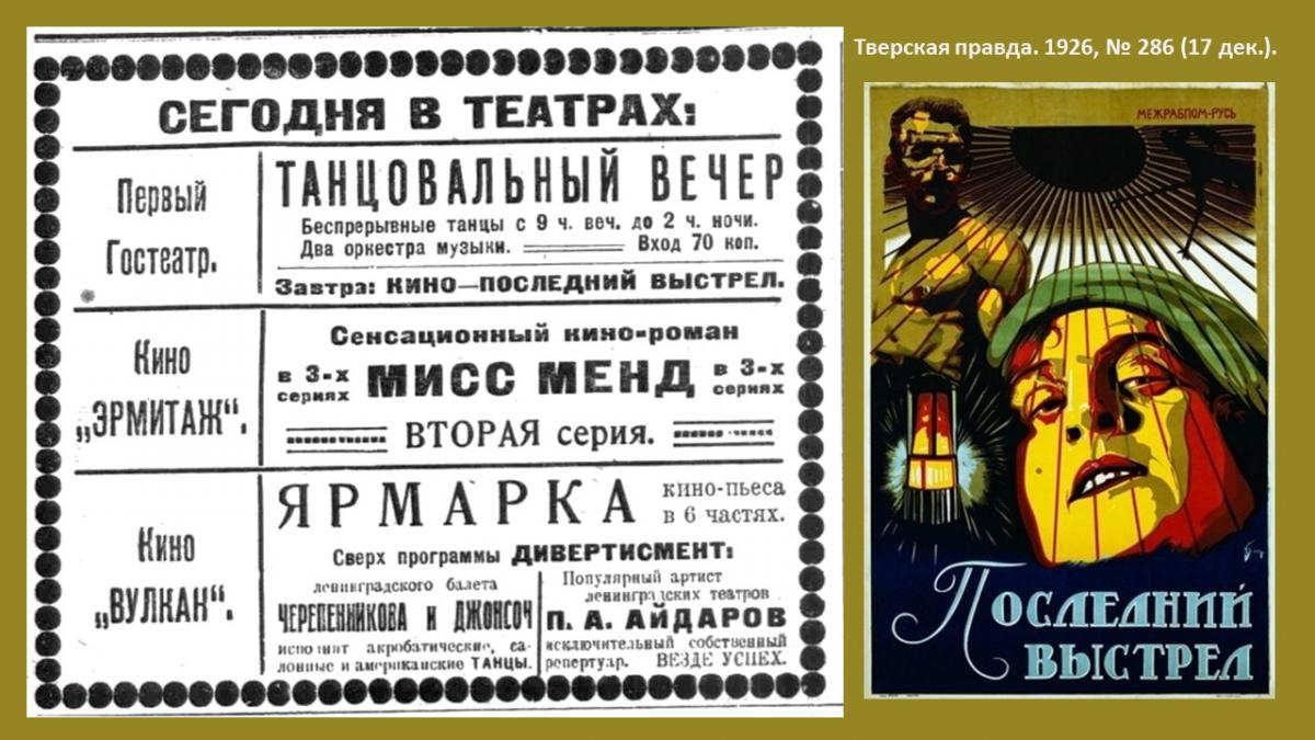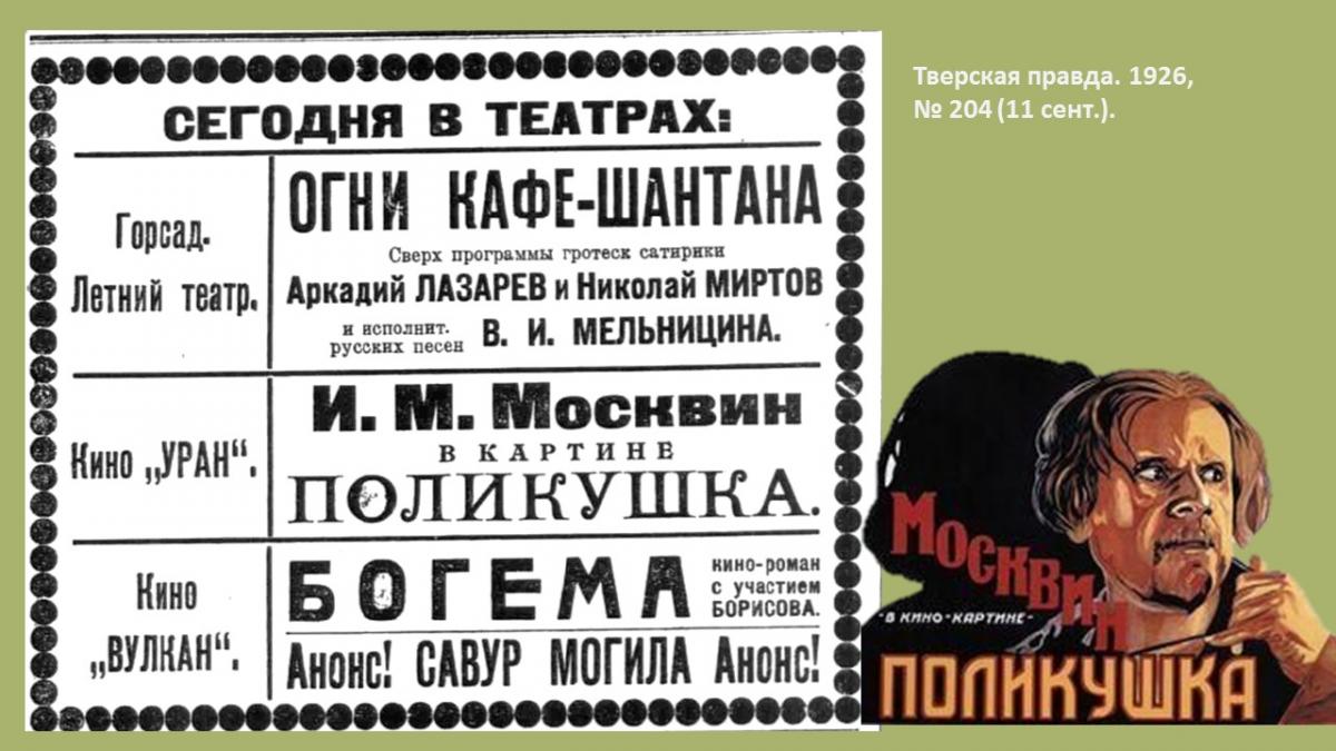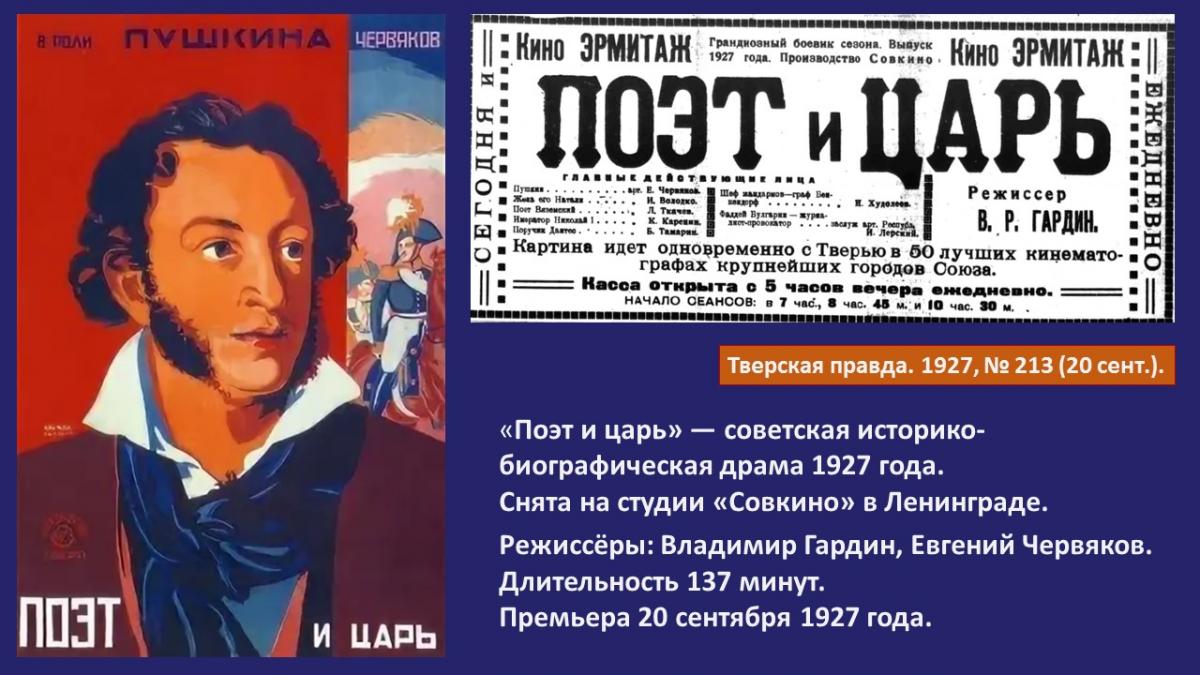 Тверь, в 20-е годы ХХ века, совершенно не отставала от общего движения, кино здесь смотрели и любили. Новинки кинопроката доходили до тверской публики практически сразу же после премьер, а иногда, как в случае с фильмом «Поэт и царь» (1927), картину показали в кинотеатре «Эрмитаж» одновременно с 50-ю лучшими кинематографами крупнейших городов Союза. Просматривая подшивки газеты «Тверская правда» за 1920—1927 годы, мы можем видеть массу рекламных объявлений зазывающих горожан в «Вулкан», «Уран», «Эрмитаж» — тверские кинотеатры, а летом на большое гулянье в Городской сад, где в Летнем театре тоже крутили киноленты.