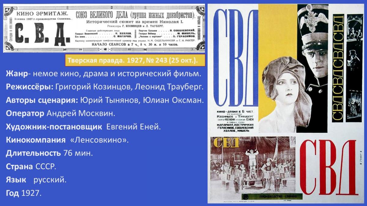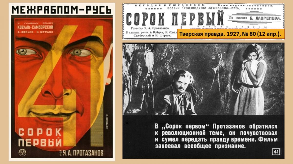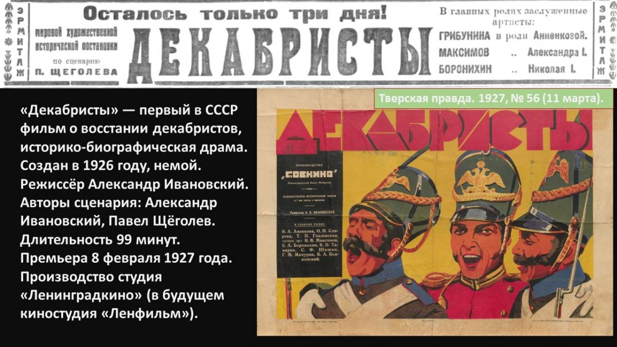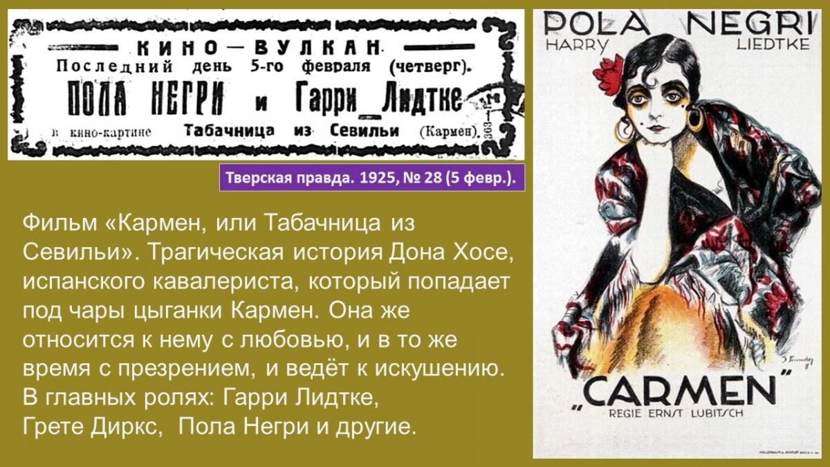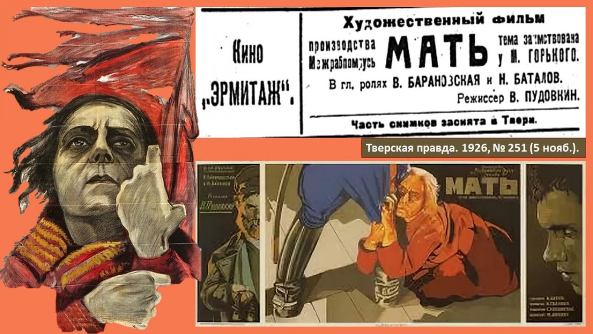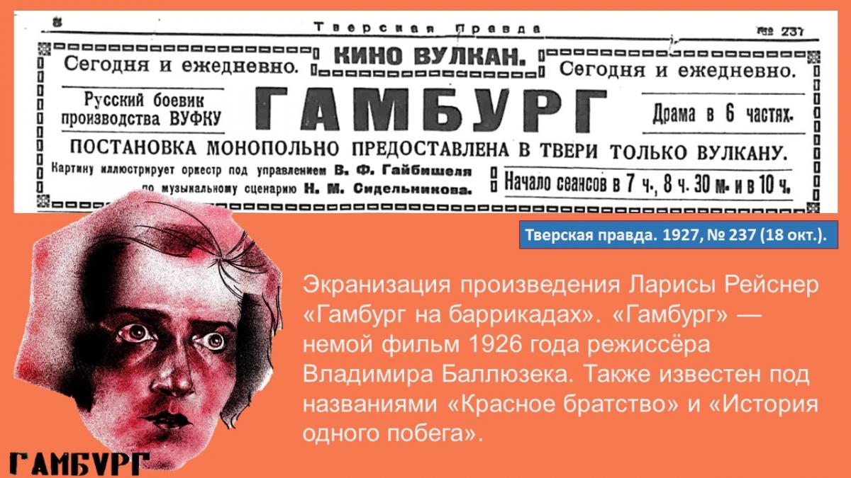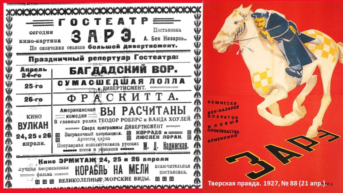 Тверь, в 20-е годы ХХ века, совершенно не отставала от общего движения, кино здесь смотрели и любили. Новинки кинопроката доходили до тверской публики практически сразу же после премьер, а иногда, как в случае с фильмом «Поэт и царь» (1927), картину показали в кинотеатре «Эрмитаж» одновременно с 50-ю лучшими кинематографами крупнейших городов Союза. Просматривая подшивки газеты «Тверская правда» за 1920—1927 годы, мы можем видеть массу рекламных объявлений зазывающих горожан в «Вулкан», «Уран», «Эрмитаж» — тверские кинотеатры, а летом на большое гулянье в Городской сад, где в Летнем театре тоже крутили киноленты.