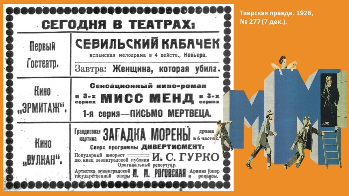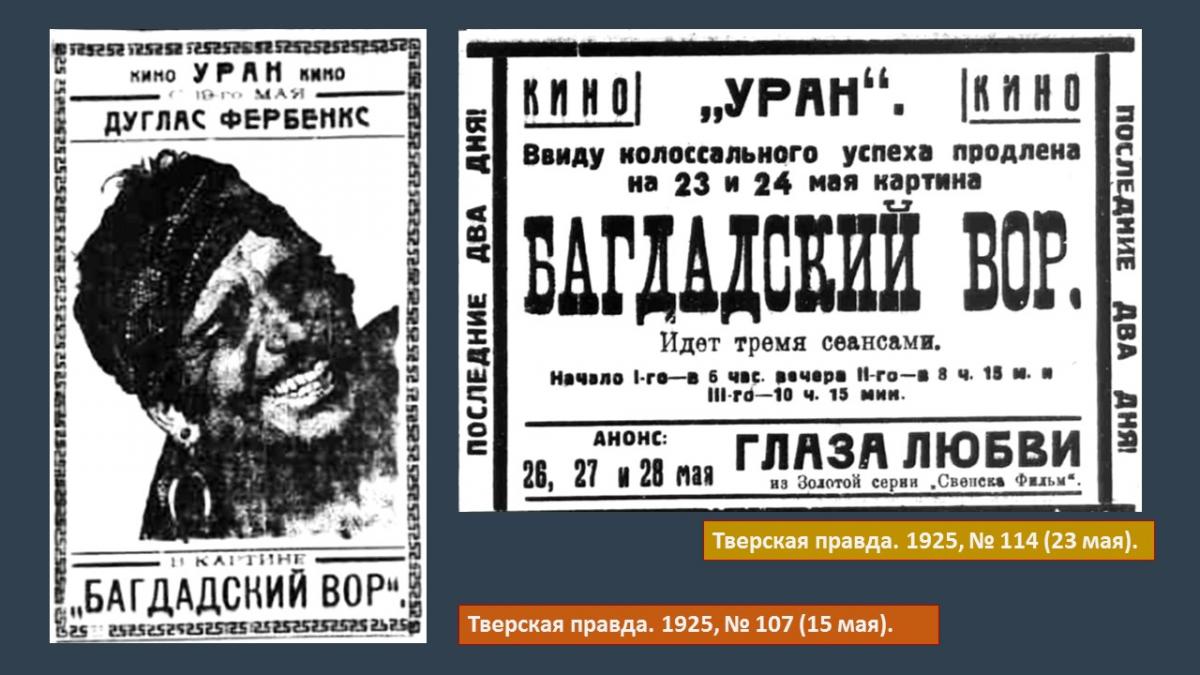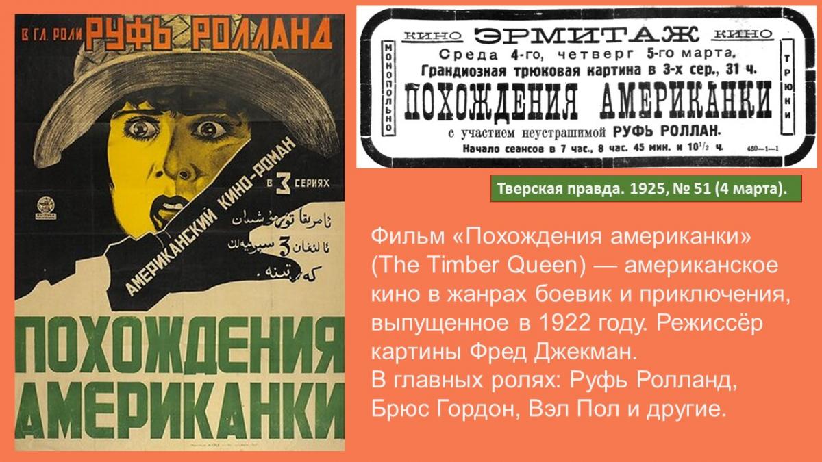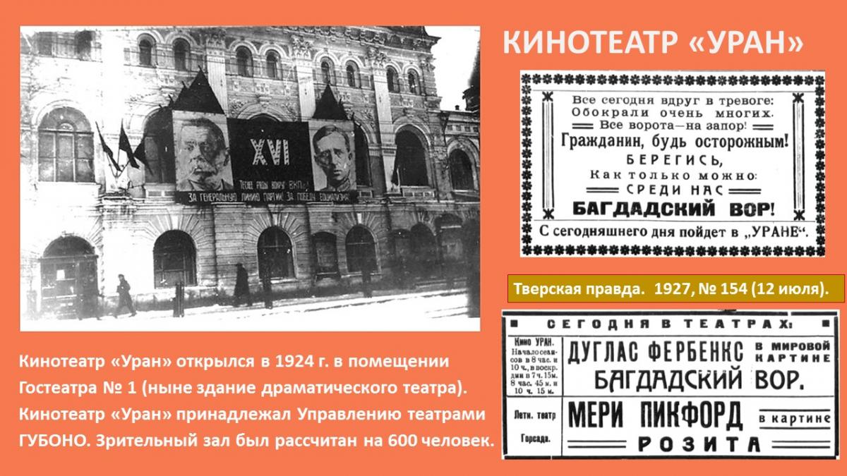 Многие популярные западные ленты шли в советском прокате. Тверская публика была знакома с Дугласом Фэрбенкса и Мэри Пикфорд, Полой Негри и Эмилем Яннингсом, Чарли Чаплиным и Руфь Ролланд. Фильмы с их участием шли в «Вулкане» «Уране» и «Эрмитаже», а летом в открытом кинотеатре городского сада.