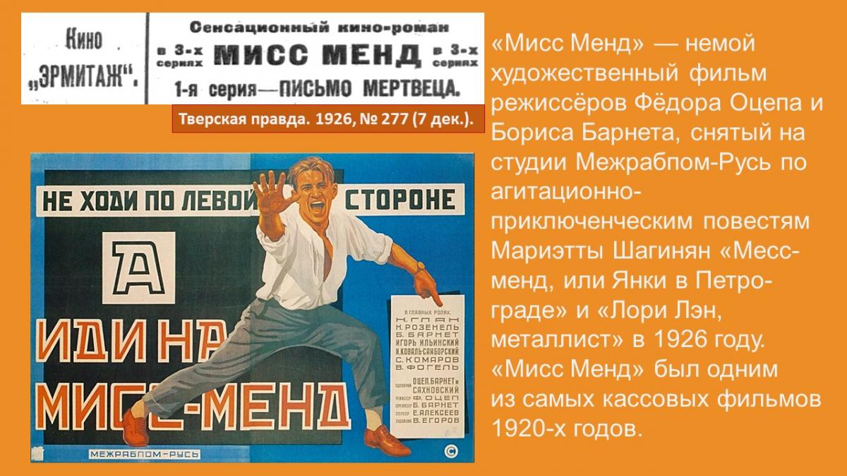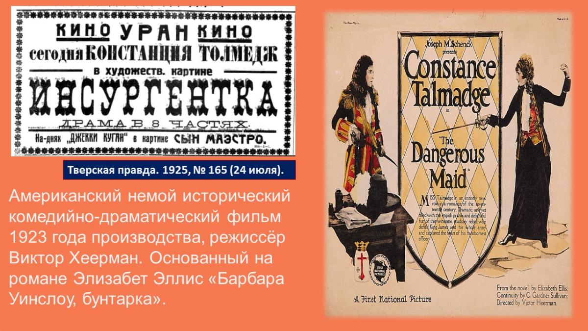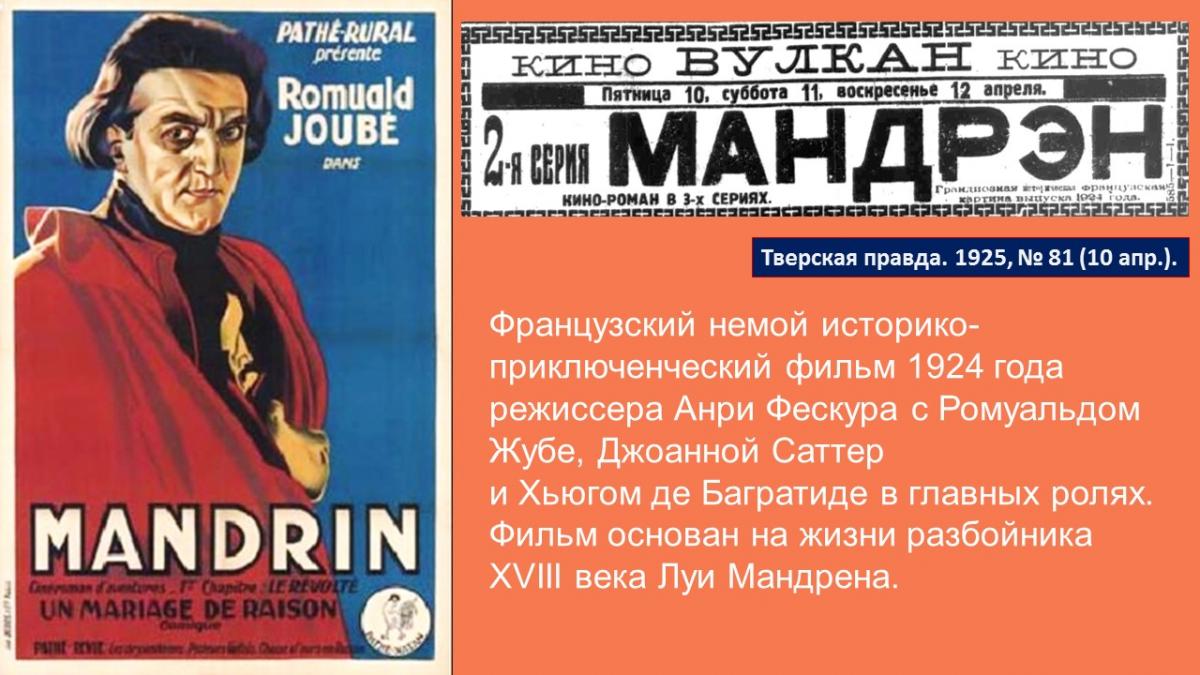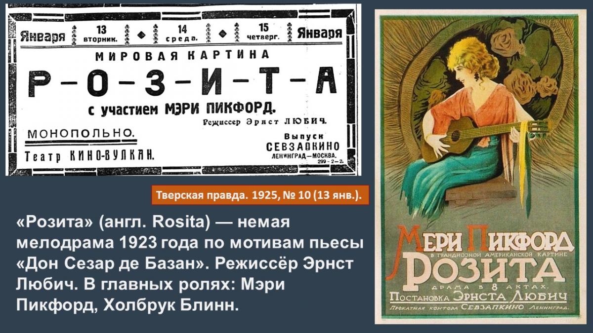 Многие популярные западные ленты шли в советском прокате. Тверская публика была знакома с Дугласом Фэрбенкса и Мэри Пикфорд, Полой Негри и Эмилем Яннингсом, Чарли Чаплиным и Руфь Ролланд. Фильмы с их участием шли в «Вулкане» «Уране» и «Эрмитаже», а летом в открытом кинотеатре городского сада.