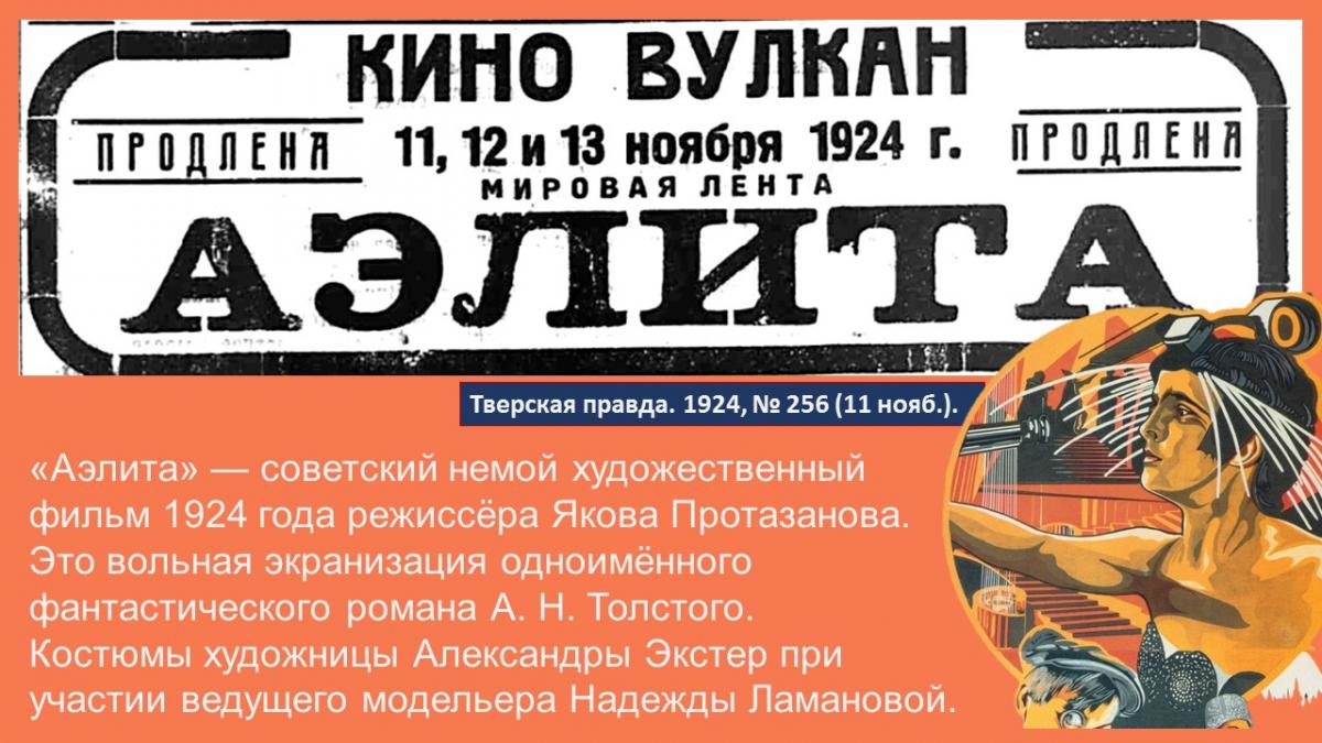 Первый советский фильм из жанра научной фантастики. В качестве литературной основы был взят опубликованный незадолго до того и пользовавшийся популярностью у читателя одноименный роман Алексея Толстого. Несколько расплывчатый идейно, роман строился на оригинальной фабуле (межпланетная экспедиция) и давал интересный и разнообразный материал для создания занимательного кинозрелища. В нём причудливо переплетались сочные бытовые сцены московской жизни первых лет НЭПа с фантастическими эпизодами - полетом на Марс, встречей "земного" инженера с правительницей Марса Аэлитой, попыткой восстания "пролетарской части" марсиан против своих угнетателей и его разгромом. Роман завершался благополучным возвращением межпланетной экспедиции на Землю. Костюмы – художницы Александры Экстер при участии ведущего модельера - Надежды Ламановой.