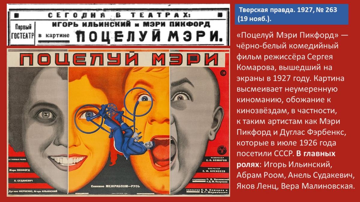 Документальная хроника приезда артистов легла в основу художественного фильма «Поцелуй Мэри Пикфорд» (1927) режиссёра Сергея Комарова, где документальные кадры, когда Пикфорд поцеловала одного из поклонников, были перемонтированы и окружены целой художественной любовной историей с советским парнем Гогой в исполнении Игоря Ильинского. Вернувшиеся в Голливуд звёзды не подозревали, что стали главными актёрами в художественной комедии. О существовании фильма Пикфорд узнала уже в конце жизни, а тверские зрители увидели этот фильм в том же 1927 году.